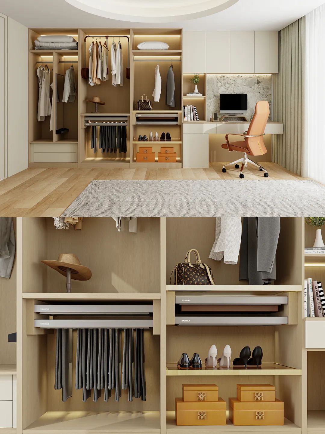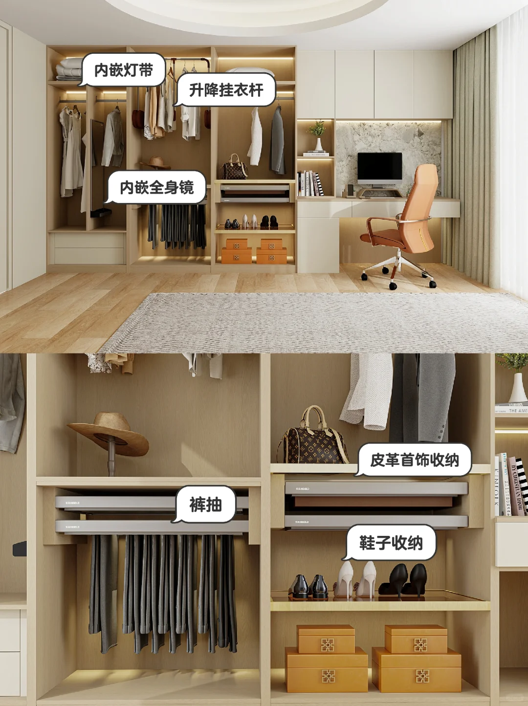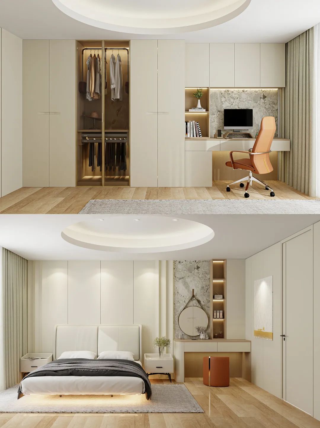 ??書桌柜與衣柜一體化設(shè)計(jì),視覺(jué)效果更整體流暢,節(jié)省空間的同時(shí)也加大了儲(chǔ)物空間。