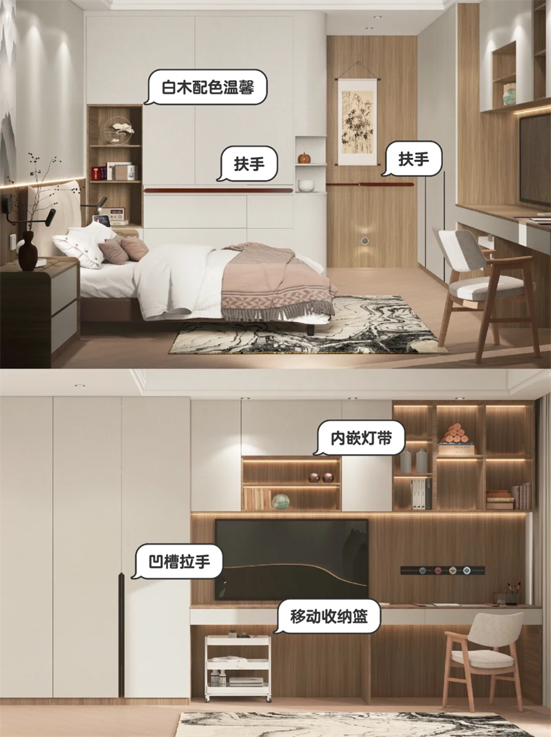 ??在衣柜門和進(jìn)門墻面增加了扶手設(shè)計(jì),老人行動(dòng)有支撐更加安全便捷。