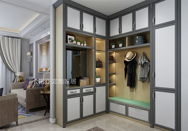 為了防止空間不足,設(shè)計(jì)師做了到頂處理,開放空間用于放置傘、手表之類的出門必備物品。