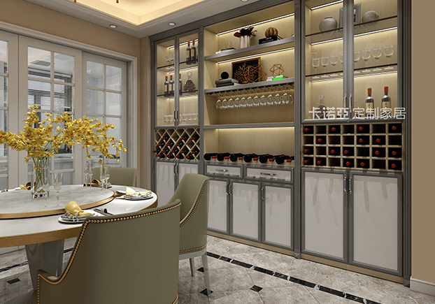 餐廳則選用了歐式風(fēng)格明顯的餐椅及現(xiàn)代風(fēng)格明顯的餐桌,在復(fù)雜與簡約上取得了微妙的平衡。背景墻則做了整面的餐邊柜,用于放置多余的餐具廚具、干貨雜貨、酒杯、飾品等,為廚房空間收納減壓。