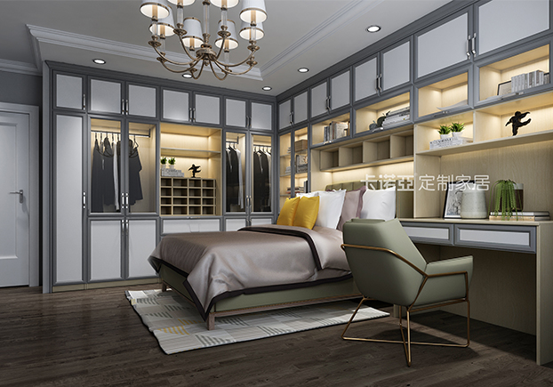 整個(gè)臥室也都是做的定制家具,除了多門的歐式大衣柜外,還有歐式風(fēng)格的床頭柜和高柜,以及桌子、吊柜一體的組合柜,收納能力杠杠的。