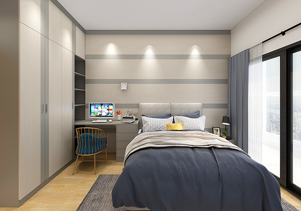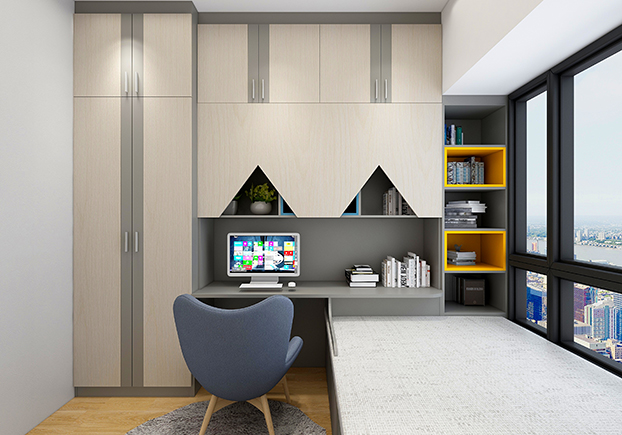榻榻米+書(shū)桌+儲(chǔ)物柜+衣柜,平??梢宰鲎鳂I(yè)、看書(shū),多功能室完成,既是書(shū)房也是臥房,儲(chǔ)物能力MAX。