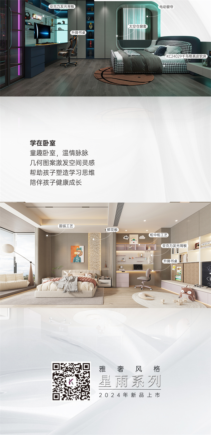 2024年新品系列,星雨 |雅奢風(fēng)格 該系列產(chǎn)品采用柔和的色彩搭配和浪漫的元素點(diǎn)綴,打造溫馨浪漫的家居氛圍。樂在臥室:潮玩魅力 炫酷聚集 娛樂游玩 精彩無限 讓個(gè)性為臥室下定義 開啟高質(zhì)量宅家度假模式