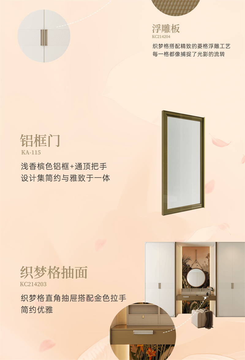2024年新品系列,爾漫 |輕法式風(fēng)格 以溫婉的設(shè)計(jì)語言,描繪精致浪漫法式生活場(chǎng)景。系列產(chǎn)品整體以奶油白和金色元素為空間基調(diào),將法式的氣質(zhì)融入現(xiàn)代空間,以精致細(xì)節(jié)的融入,讓家成為容納更多想象的美好生活殿堂,讓“美”成為一種生活態(tài)度。