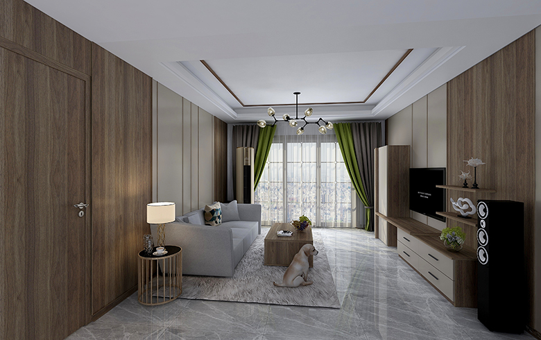 客廳護墻系統(tǒng)采用原木色與灰色的撞色設(shè)計,大小不一、顏色不同的板材拼接帶來的錯落感,專利扣線與御品木自帶的線條相呼應(yīng),豐富了色彩層次感,營造時尚、高挑的都市現(xiàn)代簡約客廳。