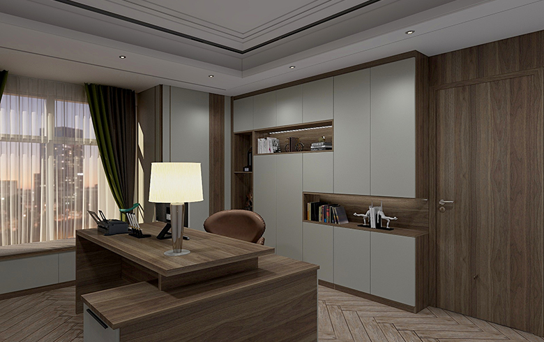 護墻系統(tǒng)采用御品木+紳士灰的創(chuàng)意混搭,配合柔和燈光,營造靜謐舒適的書房環(huán)境,專利扣線與板材花色保持統(tǒng)一無色差,且很好地包梁包柱,極大地增添了整體空間的統(tǒng)一感。