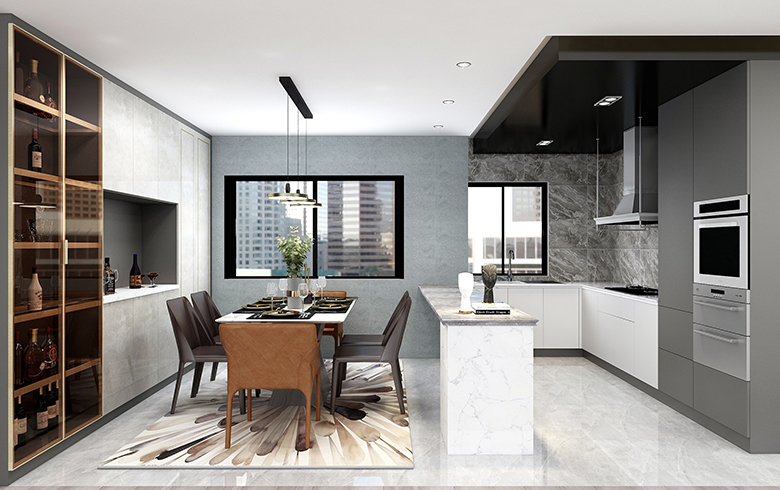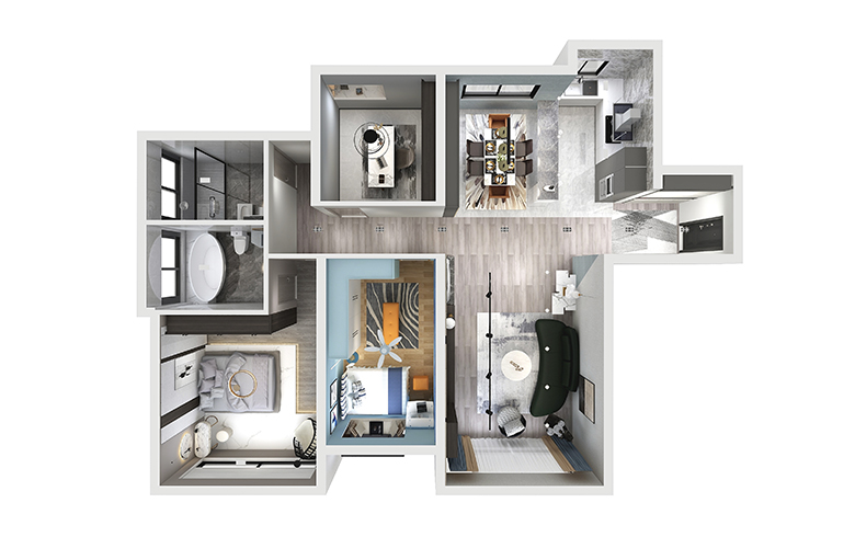 這個作品將材質巧妙的運用,客餐廳采用地磚與地板的材質區(qū)別,以及餐廳的地磚上墻等。電視墻大面積的顆粒板護墻和電視處的大理石形成材質對比等,都是在運用材質進行空間劃分和區(qū)別。材質對于設計來說就相當于一個人的外形著裝打扮給人的第一印象一樣的重要,試想一下,一個連自己的著裝外貌都不精于打理的,全身邋遢臟亂的人,又怎么會給人好感呢?