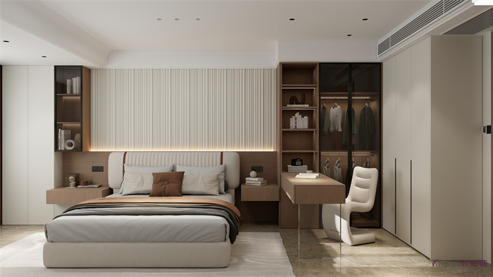 作品簡介:色彩上以自然明亮的色調為主要選擇,如米色、原木色、米白色、灰色以及米黃色等。在材料的選擇上,自然元素如木材、銅、純棉以及手工編織的織物是常見的材料。整體風格上旨在,混合紋理和面料能夠增強房間的質感和視覺效果。使這個空間呈現(xiàn)出來多樣化的,包容性強的空間氛圍。在精致低奢的前提下代入一些生活美學的魅力。簡約、低調且時尚是其特點。