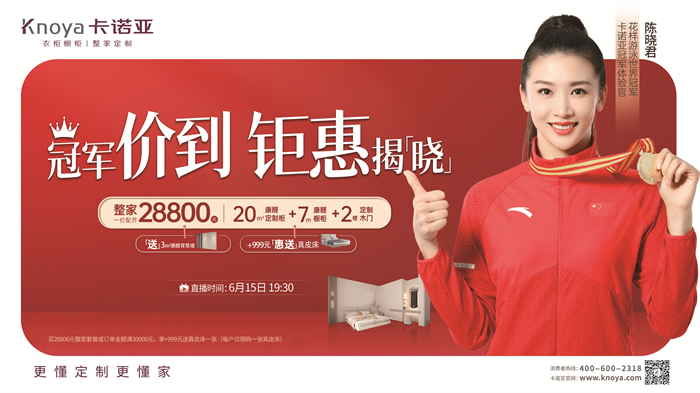 “冠軍價(jià)到,鉅惠揭「曉」”超級(jí)直播活動(dòng),將于6月15日19:30準(zhǔn)時(shí)開播,卡諾亞將攜手花樣游泳世界冠軍陳曉君,解鎖高顏高品整家空間的新花樣。作為卡諾亞冠軍體驗(yàn)官,陳曉君將空降卡諾亞直播間,親自帶領(lǐng)粉絲們一同體驗(yàn)卡諾亞柜墻門一體的冠軍品質(zhì),為大家狂派618家裝福利,此外直播期間還有更多派禮、免單、抽獎(jiǎng)活動(dòng)等驚喜福利,精彩不止、寵粉不停,絕對(duì)不容錯(cuò)過!