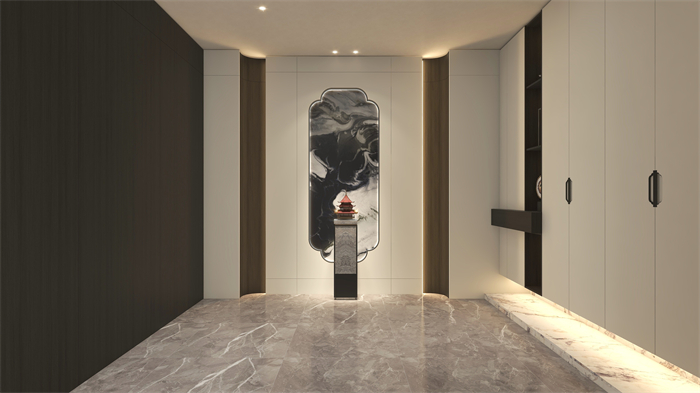 門廳:新中式元素“奢石”地臺作為點綴,開啟新國潮視覺盛宴。護墻板燈帶勾勒出簡約的宮燈形狀,與右邊柜門的燈籠造型拉手遙相呼應(yīng)。對稱式圓弧轉(zhuǎn)角,將護墻板與玄關(guān)柜柔美連接,渾然一體,自然天成。