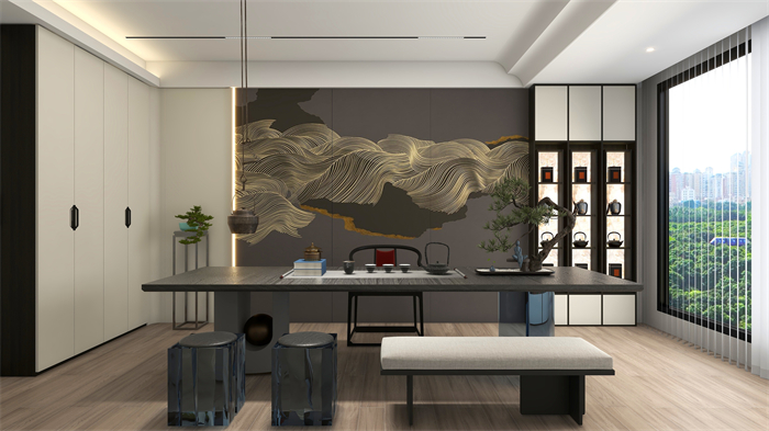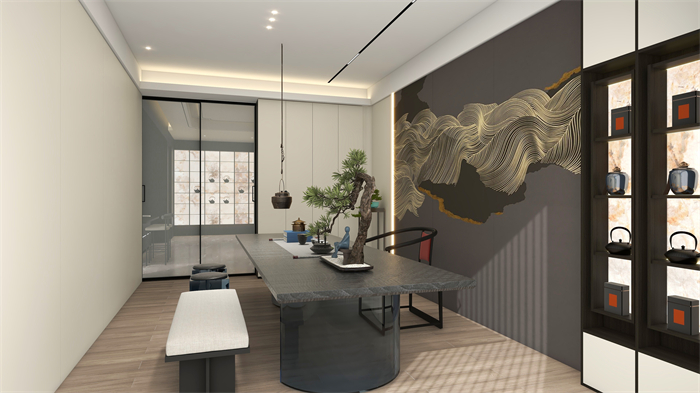 茶室:打破傳統(tǒng)對稱均衡,一側(cè)一門到頂封閉柜,一側(cè)半開放式設(shè)計,既彰顯東方韻味,又為視覺做減法,簡單大雅。玻璃的通透與木紋的肌理相互交融,剛?cè)嵯酀?,精致而高級?/span>