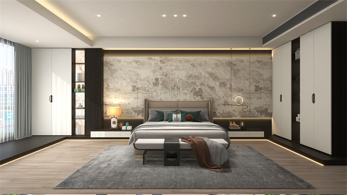 主臥:衣柜及床頭柜采用對稱式設(shè)計,與圓形燈裝飾掛件形成了方與圓的空間禮序,多處鏤空設(shè)計展示朦朧透視的詩意想象。床尾凳實用與顏值兼?zhèn)洌┑囊路梢苑旁谶@里,還可充當(dāng)早餐椅,就著陽光,吃著早餐。深色U型地臺將淺色柜體抬起,收納與顏值兼?zhèn)洌?D錯落增加懸浮感,搭配古風(fēng)市井畫,夢回千年古都。