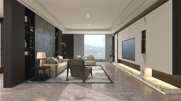沙發(fā)背景啞黑鋁板柜對稱設(shè)計,與深色“沉香”完美契合,遇見東方禮序之美,木紋、石紋、鋁板,傳統(tǒng)與現(xiàn)代材質(zhì)碰撞彰顯層次感,搭配國風(fēng)家品,更顯東方意境。