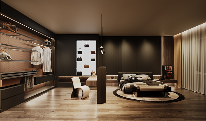 紳·逸系列設(shè)計靈感上,源于繁華都市的夜晚,低沉的色調(diào)彰顯當(dāng)代企業(yè)家“閑在臥室”的生活狀態(tài),靜謐中暗藏內(nèi)斂奢華。設(shè)計手法上,整個系列展示兩個空間(客廳、臥室),以高級灰搭配深色木紋為主基調(diào),配合流行的弧形及斜邊工藝。低調(diào)素雅的整體視覺,充分詮釋意式輕奢的美學(xué)。臥室空間結(jié)合睡眠、衣帽間及輕健身功能,符合成功人士對高品質(zhì)生活和健康人生的追求。