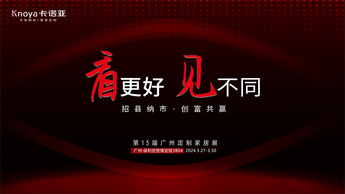 2024年3月27日-30日,第13屆中國廣州定制家居展覽會,將在廣州保利世貿(mào)博覽館舉行。存量房時代,下游家居業(yè)處于變革發(fā)展周期,市場分級、用戶分層,越來越多企業(yè)通過創(chuàng)新尋求業(yè)績新增長點,定制家居業(yè)迎來新一輪高質(zhì)量發(fā)展變革浪潮。專注定制家居23年的卡諾亞,將攜1121戰(zhàn)略、2大新品強(qiáng)勢亮相本屆展會,助力加盟商打造差異化競爭優(yōu)勢。屆時誠邀各界精英蒞臨3B04展館,看更好的卡諾亞,見不同的大未來,廠商攜手“招縣納市·創(chuàng)富共贏”。