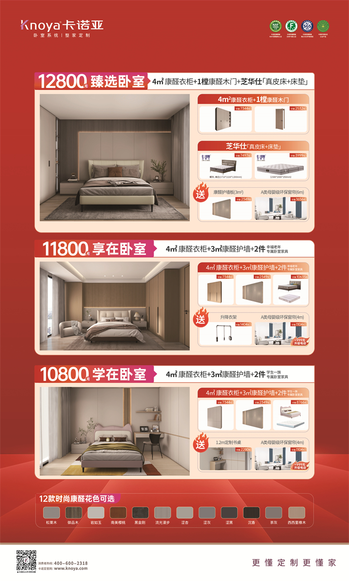 五一大促,卡諾亞力推12800元臻選臥室套餐,以及針對幸福老年的11800元享在臥室套餐、學(xué)生一族的10800元學(xué)在臥室套餐,不僅實(shí)現(xiàn)消費(fèi)者一站式購齊,還為其帶來更多的便利和千人千面的個性化解決方案。3大套餐均包含4㎡康醛衣柜,可選十余款時尚個性的飾面花色,還有3㎡康醛護(hù)墻板、1樘康醛木門、2件專屬臥室家具、芝華仕大牌真皮床+床墊,驚喜獲贈6米或4米A類母嬰級環(huán)保窗簾、1.2米定制書桌、升降衣架等,套餐明細(xì)請親臨門店咨詢??ㄖZ亞精心設(shè)計的臥室套餐,可確保與整體家居布局的協(xié)調(diào)與統(tǒng)一,全面提升臥室氣質(zhì),滿足不同消費(fèi)者的進(jìn)階居住體驗(yàn)和對品質(zhì)美好生活的追求。