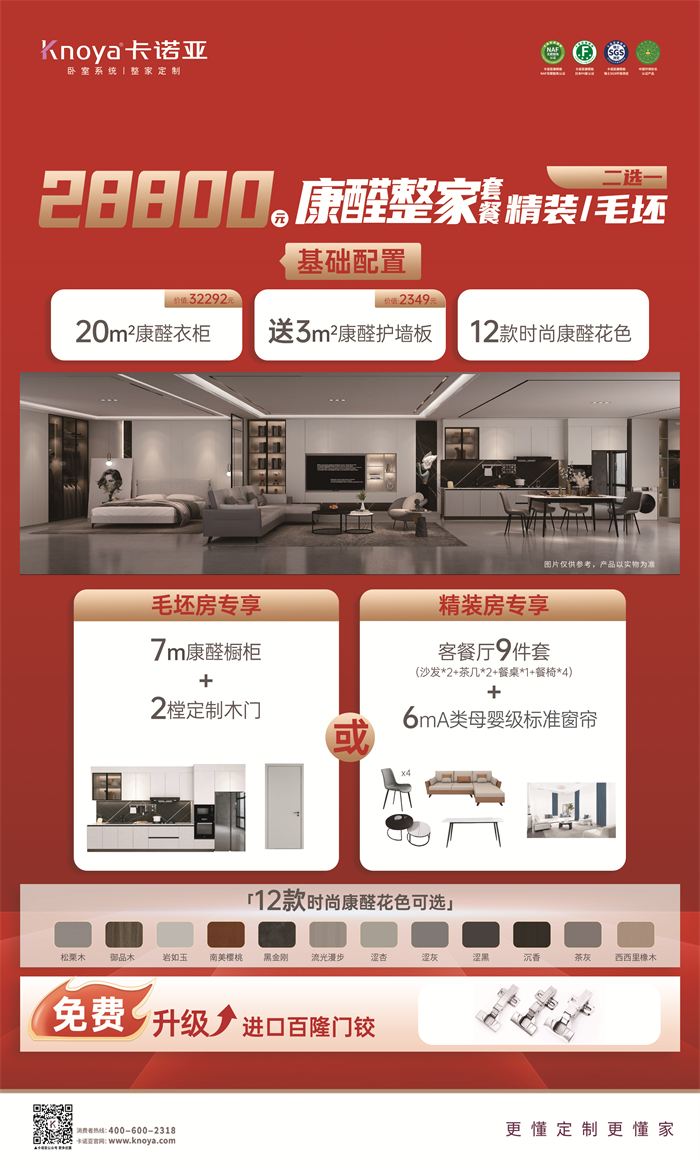 卡諾亞28800元康醛整家套餐,針對毛坯房精準(zhǔn)推出20㎡康醛定制柜+3㎡康醛背景墻+7米康醛廚柜+2樘定制木門;針對精裝房精準(zhǔn)推出20㎡康醛定制柜+3㎡康醛背景墻+全屋客餐廳9件套+6米A類母嬰級環(huán)保窗簾。本套餐定制柜及背景墻,均可選十余款康醛時尚花色,可免費(fèi)升級進(jìn)口百隆門鉸。