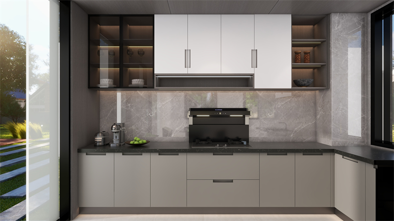 吊柜和地柜分別搭配“晨露白”和“薄暮灰”,中間輔以大理石紋,暖意徜徉,煙火氣撲面而來。整體視覺干凈大氣,玻璃門點(diǎn)綴,增強(qiáng)視覺通透感與層次感。