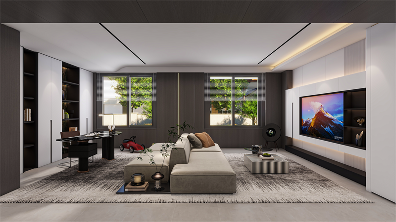 電視背景墻采用簡(jiǎn)潔流暢的線條,與簡(jiǎn)約的“晨露白”色彩完美融合,弧形轉(zhuǎn)角過渡,展現(xiàn)一種簡(jiǎn)約而不失精致的柔美感。電視柜采用高端定制精湛工藝,包括黑科技的懸浮設(shè)計(jì)+柜中柜設(shè)計(jì)+拉米諾/無孔工藝,打破傳統(tǒng)墻面的厚重感,賦予空間輕盈靈動(dòng)的觀感。