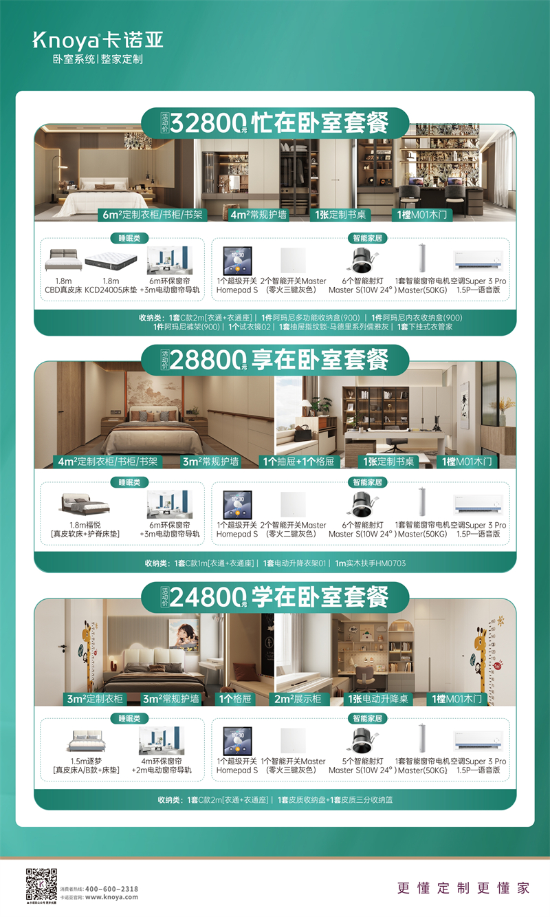 卡諾亞此次315活動(dòng),攜手多個(gè)高端品牌如芝華仕、CBD、云米科技等,為消費(fèi)者提供一站式的家居解決方案?;顒?dòng)期間,卡諾亞除了以上2大套餐,還精心推出32800元忙在臥室套餐、28800元享在臥室套餐、24800元學(xué)在臥室套餐等,涵蓋臥室系統(tǒng)+整家定制兩大品類(lèi),包括定制柜、護(hù)墻板、全屋家具以及智能家電,聯(lián)手更多大牌,真正實(shí)現(xiàn)“整家定制更高配,全屋家具更滿(mǎn)配,智能家電更全配”的理念。