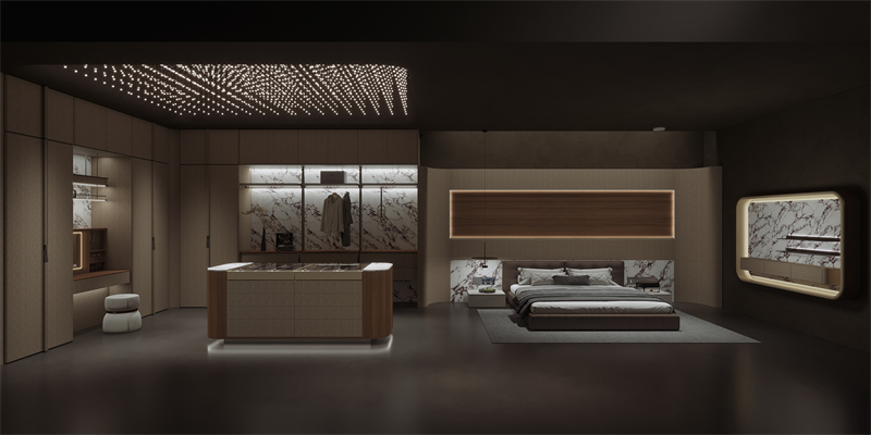 靈感源于“藏物之雅,玉之恒久”,藏玉系列以新中式為魂,通過“形、質(zhì)、氣、韻、神”五重境界,打造步移景異的敘事空間。天然胡桃木皮與數(shù)碼打印石紋的碰撞,原創(chuàng)品牌LOGO拉手與倒R角工藝的巧妙結(jié)合,為35-55歲企業(yè)高管精英構(gòu)建了一個(gè)禮序雅境。金屬雕刻沖孔板、格柵板勾勒光影韻律,透光彎曲板演繹虛實(shí)意境,在這樣的設(shè)計(jì)下,居者于歸家禮儀中重拾精神棲居的詩意。