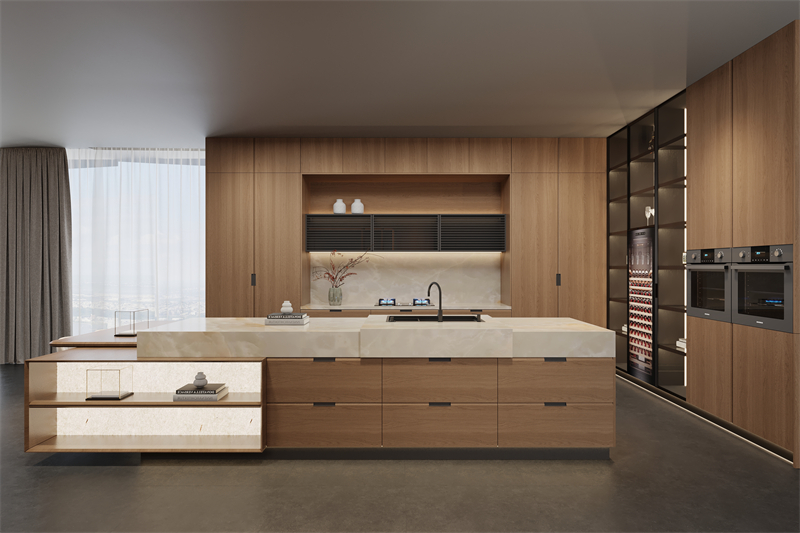 產(chǎn)品亮點:1.形:K冕拉手門型將冠冕與K字原創(chuàng)設(shè)計相結(jié)合,巧妙傳遞品牌的尊榮之意。2.質(zhì):甄選天然木皮,其天然紋理與自然色彩,賦予空間沉穩(wěn)深邃之感。3.氣:鑲嵌、圓弧、3D數(shù)碼打印等傳統(tǒng)工藝與現(xiàn)代技術(shù)結(jié)合,現(xiàn)代中式美家呼之欲出。4.韻:冰裂紋發(fā)光板的運用,宛如冰凌閃耀,映照星光,為空間增添夢幻般的詩意氛圍。5.神:中島臺升降置物架、高端智能衣物護理機等智能配置,為生活帶來便捷與品質(zhì)。