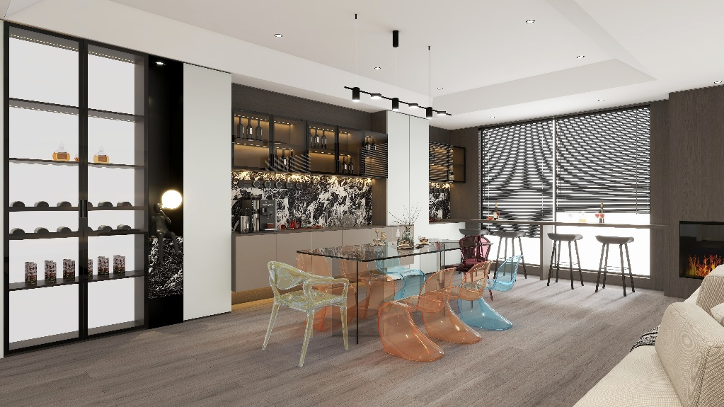 餐廳區(qū)域巧妙融入了品酒區(qū)和咖啡區(qū)。PET材質(zhì)的餐邊柜臺面觸感細膩,耐高溫且易于清潔,完美適配年輕人的生活方式。墨海云巖三胺點綴色與生椰灰主色調(diào)形成優(yōu)雅對比,營造出精致的用餐氛圍。從早餐的明亮活力到晚餐的溫馨浪漫,全方位滿足年輕人的生活儀式感。