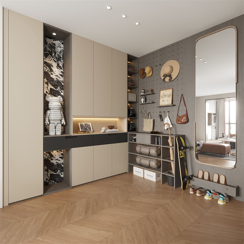推開家門,迎面而來的是精心設計的玄關空間。這里不僅是收納功能區(qū)域,更是從喧囂都市回歸寧靜生活的過渡地帶。趣逸系列玄關以穿插式設計手法打造立體視覺層次,創(chuàng)意洞洞板讓收納兼具功能性與藝術感。
