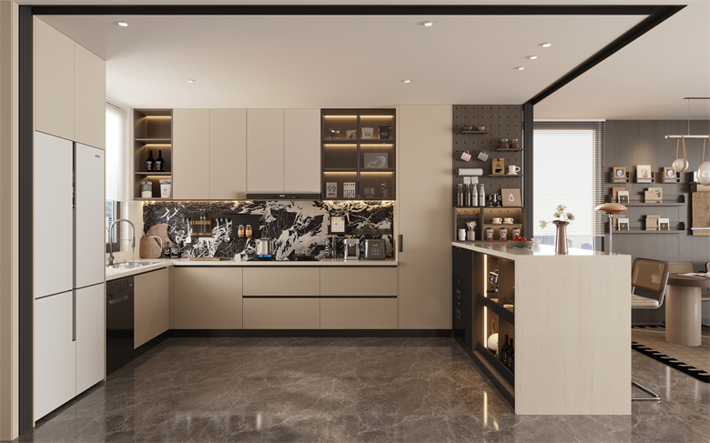 開放式餐廚設計是趣逸系列的亮點之一。小吧臺的巧妙設置既可作為早餐角,也能變身為深夜小酌的浪漫空間。彌月UV膚感櫥柜門板防指紋易清潔,內嵌式家電讓操作動線流暢合理。這里既有現(xiàn)代廚房的利落,又保留著家的溫度。
