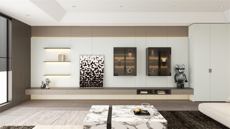 極簡的線條設(shè)計與功能性家具完美結(jié)合,讓客廳既能滿足日常休閑需求,又能隨時變身為社交場所。盲盒展示墻和娛樂區(qū)的設(shè)計,將客廳變身為年輕人的潮流共享空間。羅亞通過精心考量的空間規(guī)劃,實現(xiàn)了功能性與美學(xué)價值的平衡,營造出既時尚又舒適的氛圍。