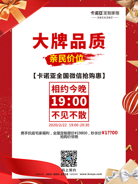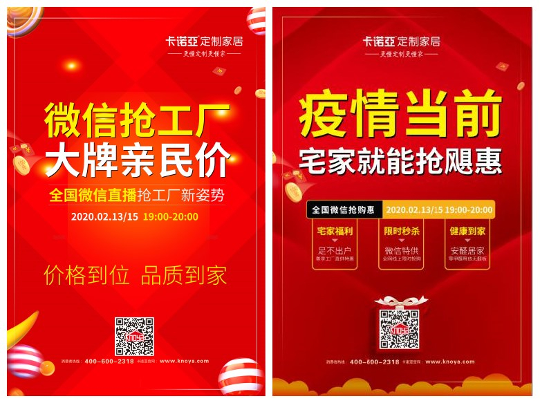 被疫情隔離的潛在裝修需求,有了線上的助力,迅速爆發(fā)出巨大潛力。眼下部分企業(yè)剛剛開始復(fù)工,物流也尚未恢復(fù)正常,對于有裝修需求的用戶而言,提前做好裝修規(guī)劃,未嘗不是宅家的另一種選擇。因此,卡諾亞采取線上微信搶購、限時(shí)優(yōu)惠等多元銷售模式,并加強(qiáng)與線上消費(fèi)者的溝通和互動(dòng),2月27日還將開啟“卡諾亞定制家居3·15品質(zhì)直播盛典”。至此,卡諾亞率先掀起的新零售模式,將成為疫情期間家裝銷售的重要渠道。