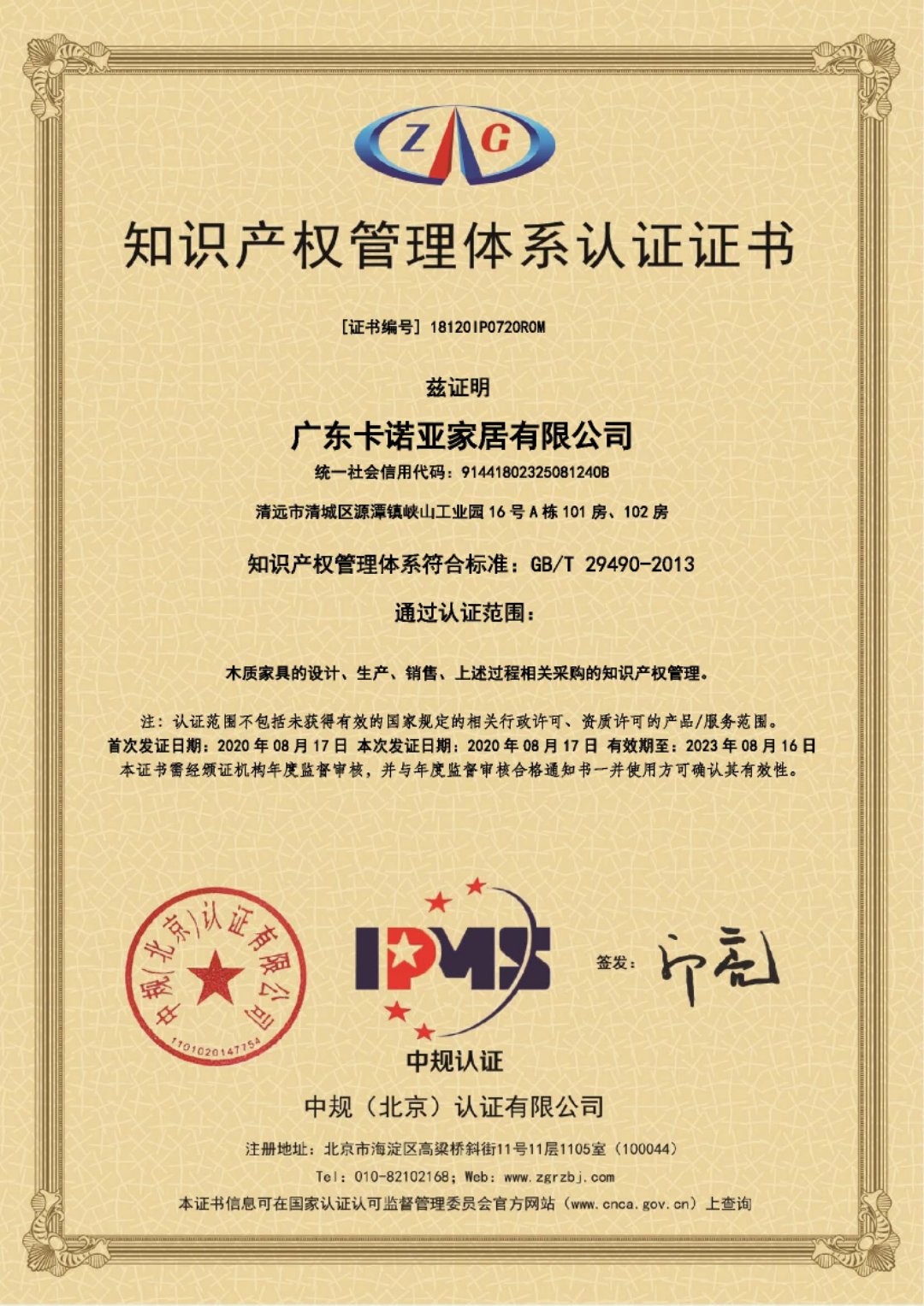 近日,經(jīng)層層嚴(yán)格的內(nèi)審、外審,作為高新技術(shù)企業(yè)的卡諾亞,順利通過中規(guī)(北京)認(rèn)證有限公司的審核,其知識產(chǎn)權(quán)管理體系完全符合國家關(guān)于企業(yè)知識產(chǎn)權(quán)管理規(guī)范的要求。獲此認(rèn)證,表明卡諾亞在推進(jìn)公司知識產(chǎn)權(quán)管理規(guī)范化方面獲得重要認(rèn)可,綜合競爭力進(jìn)一步提升,對企業(yè)健康可持續(xù)發(fā)展帶來深遠(yuǎn)影響,也為中國定制家居行業(yè)推進(jìn)知識產(chǎn)權(quán)管理體系建設(shè)樹立了標(biāo)桿。