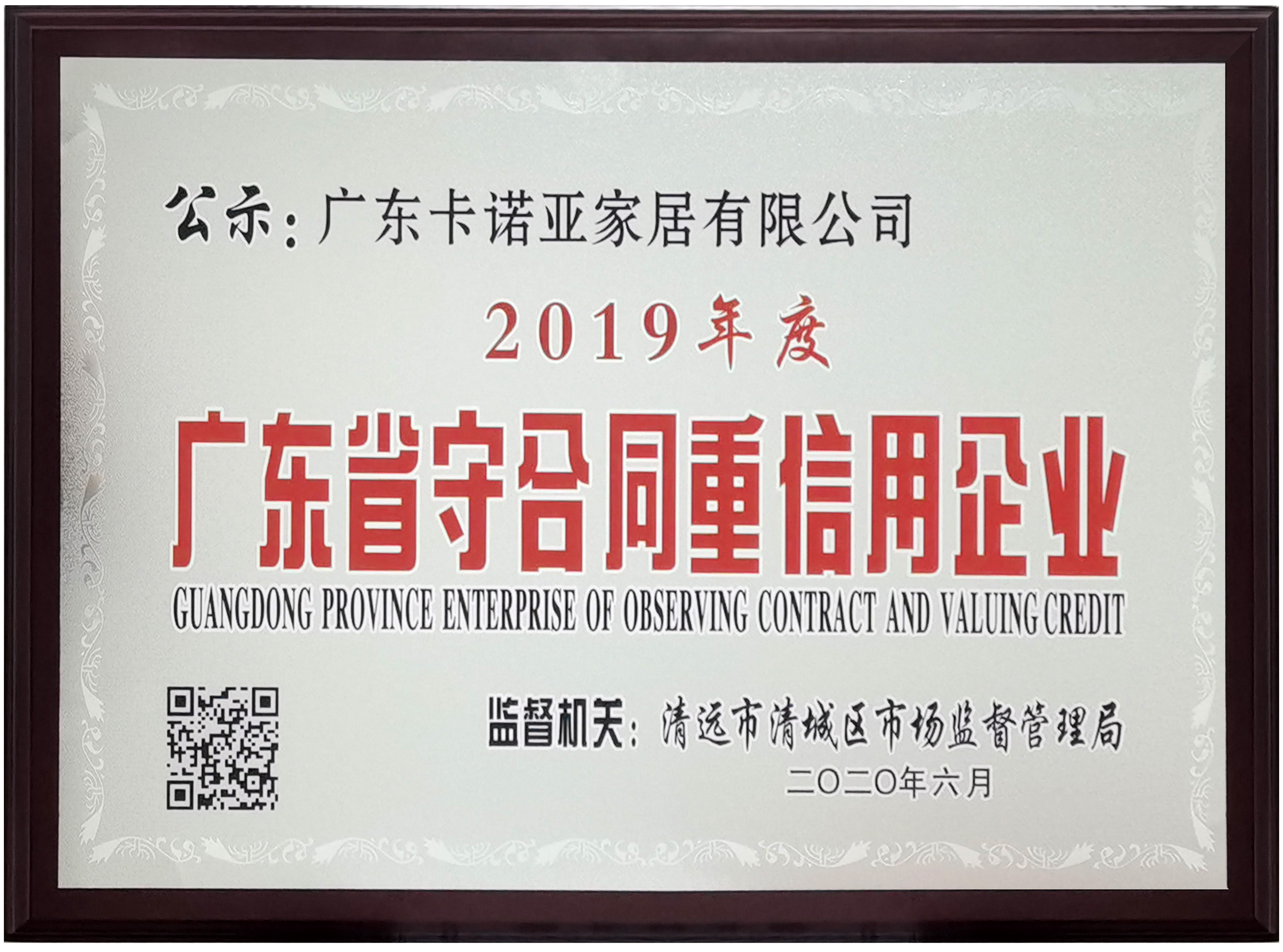 近日,廣東省清遠(yuǎn)市清城區(qū)市場(chǎng)監(jiān)督管理局對(duì)廣東省守合同重信用企業(yè)進(jìn)行公示,廣東卡諾亞家居有限公司憑借良好的信譽(yù)與契約精神,依靠19年來(lái)的誠(chéng)信經(jīng)營(yíng)與優(yōu)質(zhì)服務(wù),順利通過(guò)最終評(píng)審,獲得“2019年度廣東省守合同重信用企業(yè)”殊榮,這是對(duì)公司誠(chéng)信管理的高度肯定和誠(chéng)信服務(wù)的極大鼓勵(lì)。