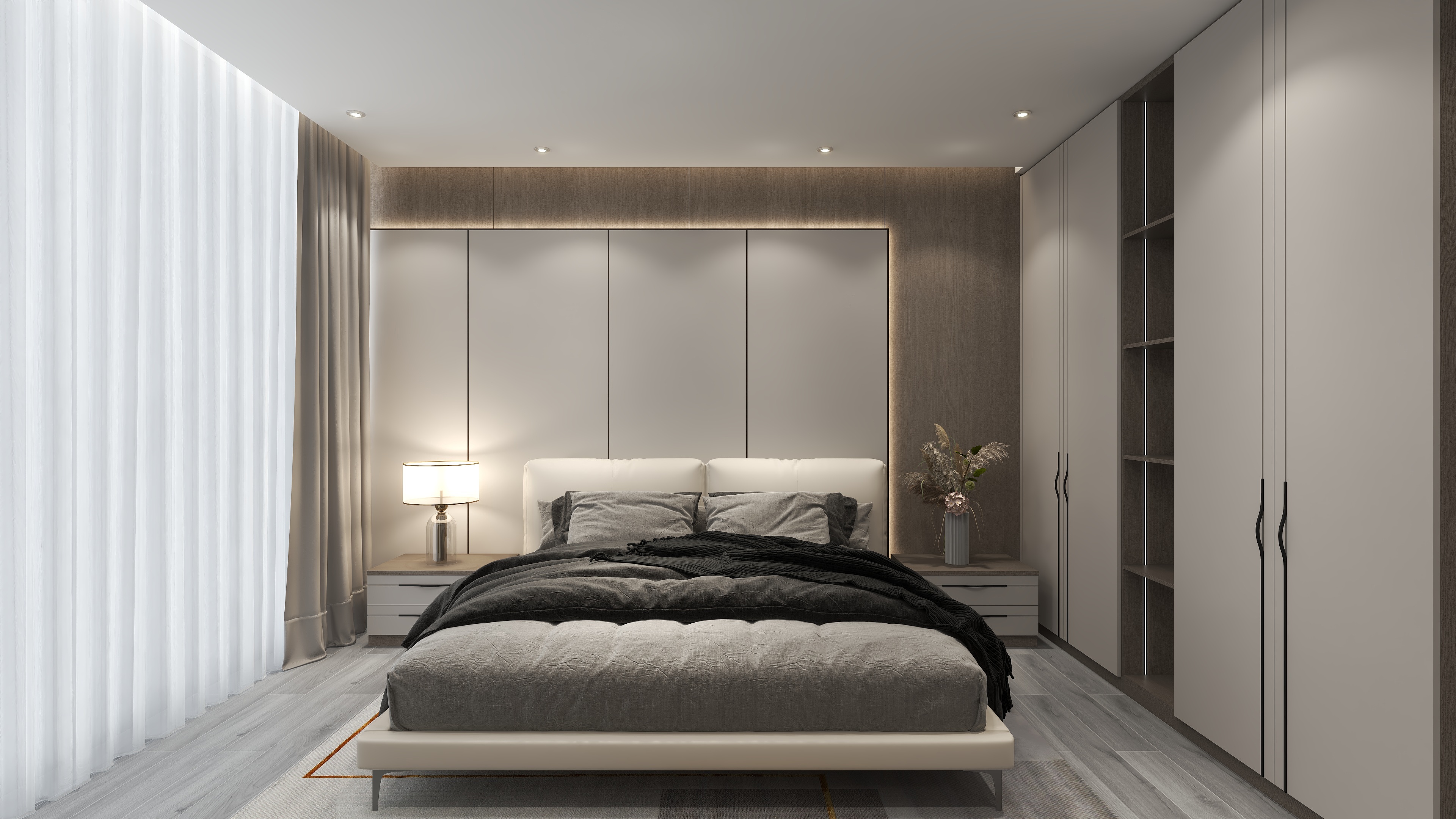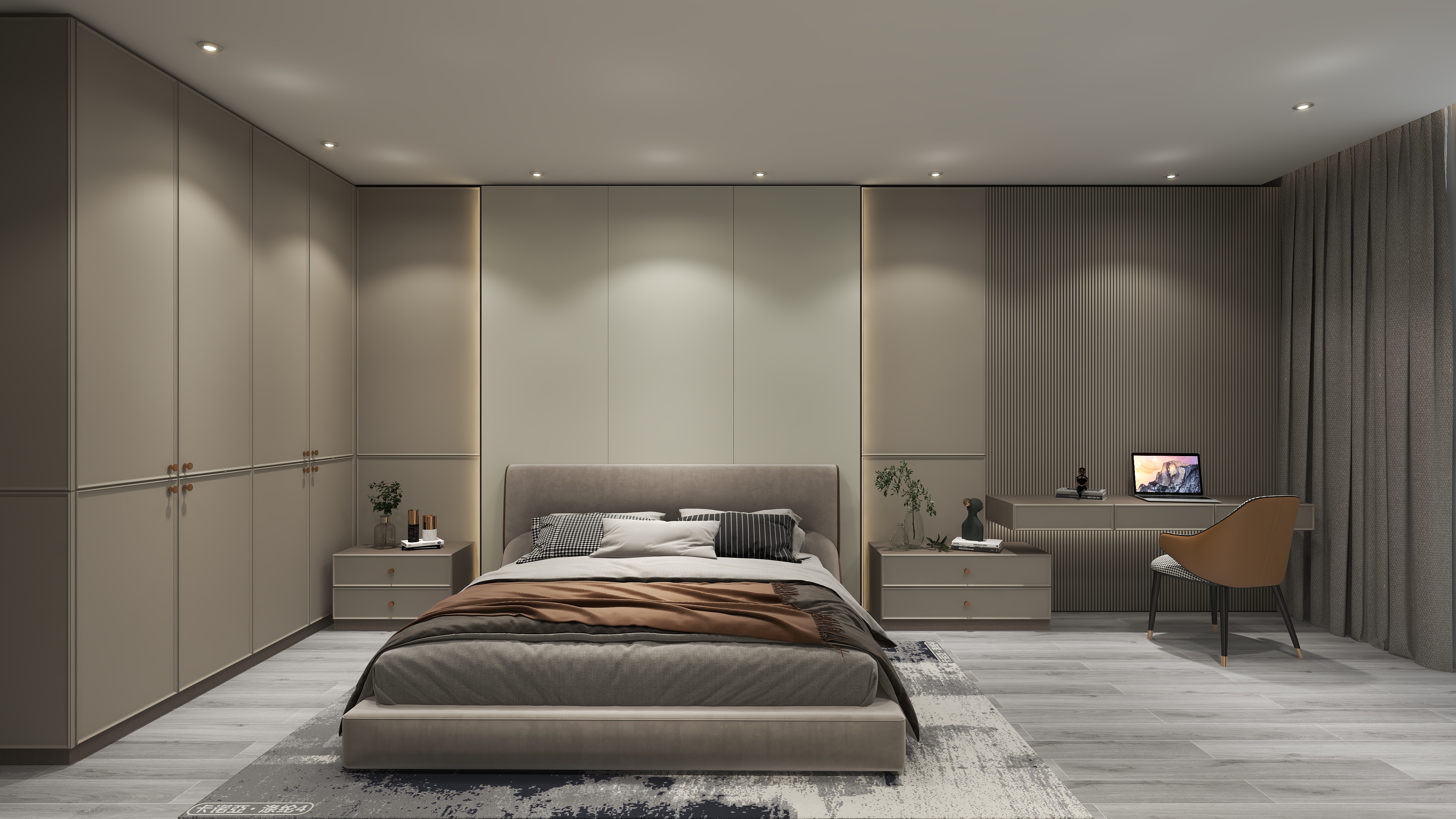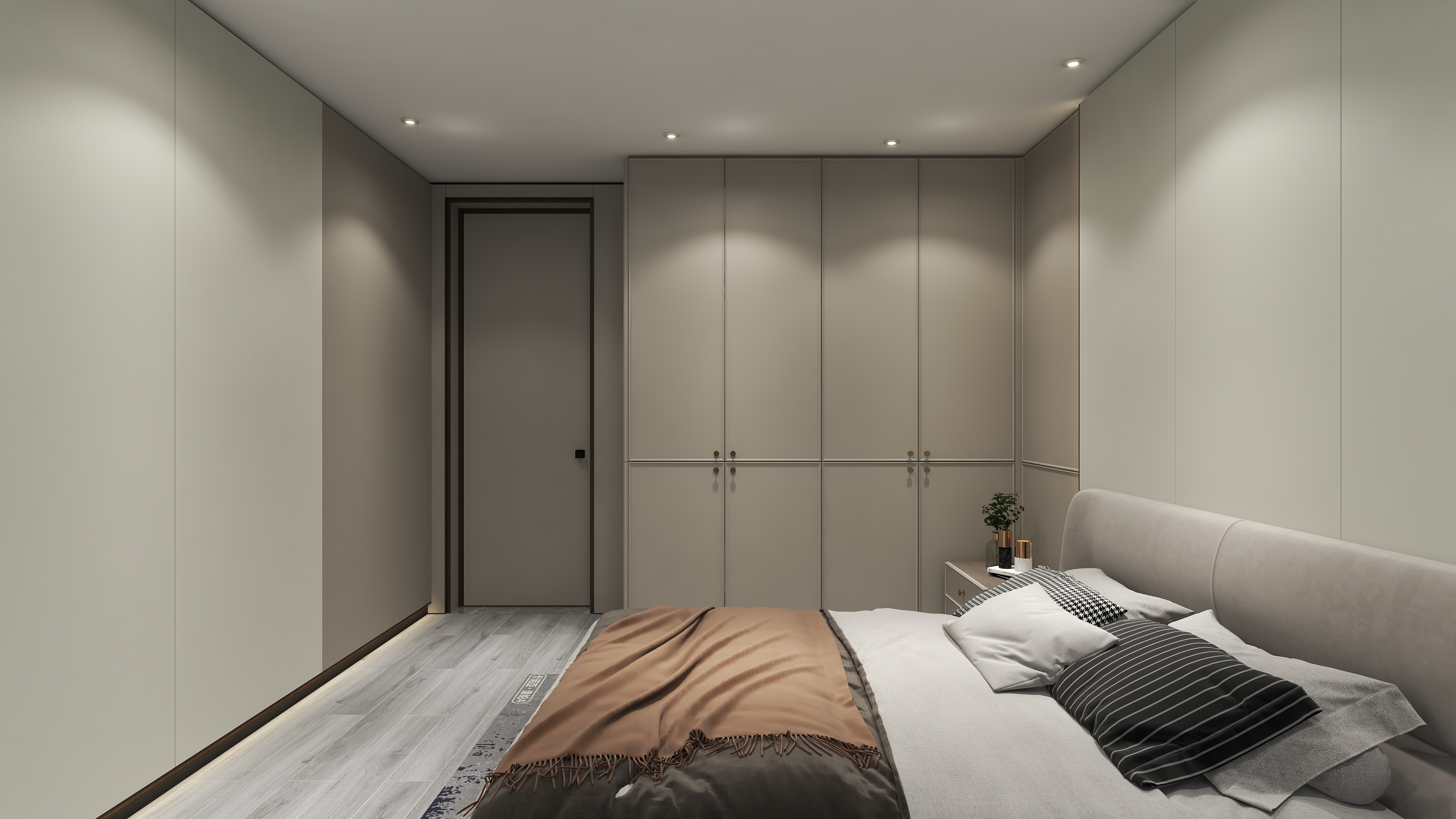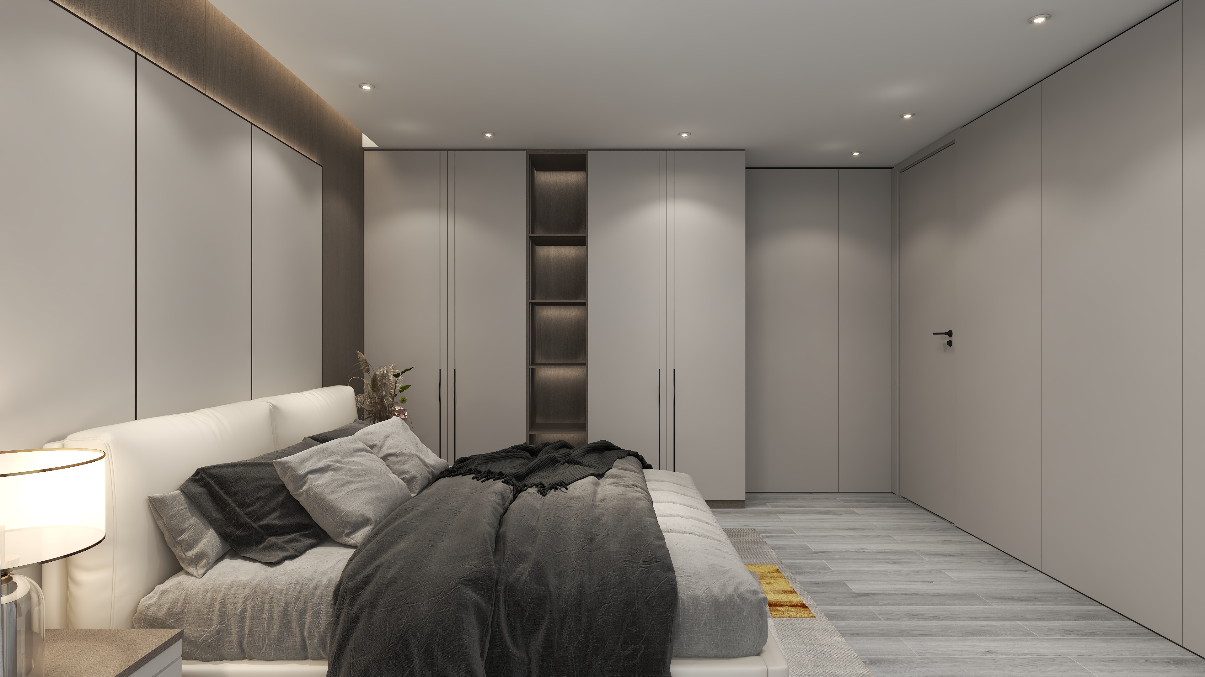 米蘭之吻系列,采用一體式柜體布局,整體動線順暢開闊。在以舒適為原則的基礎(chǔ)上,臥房護(hù)墻板及衣柜的柜門采用“嬌月白”與“優(yōu)雅暖灰”構(gòu)筑靜謐的底色,柜體采用“流光漫步”花色搭配。衣柜PVC吸塑柜門拋棄繁復(fù)的歐式紋飾,采用簡歐線型,運(yùn)用小邊框勾勒出線條靈動之美,一改傳統(tǒng)柜門一平到底的單調(diào)印象。“優(yōu)雅暖灰”花色打造的格柵立體造型護(hù)墻板,自帶高顏值的視覺享受。床頭背景墻隱藏式燈帶漫射暖光,溫馨之外更顯視覺層次感。
