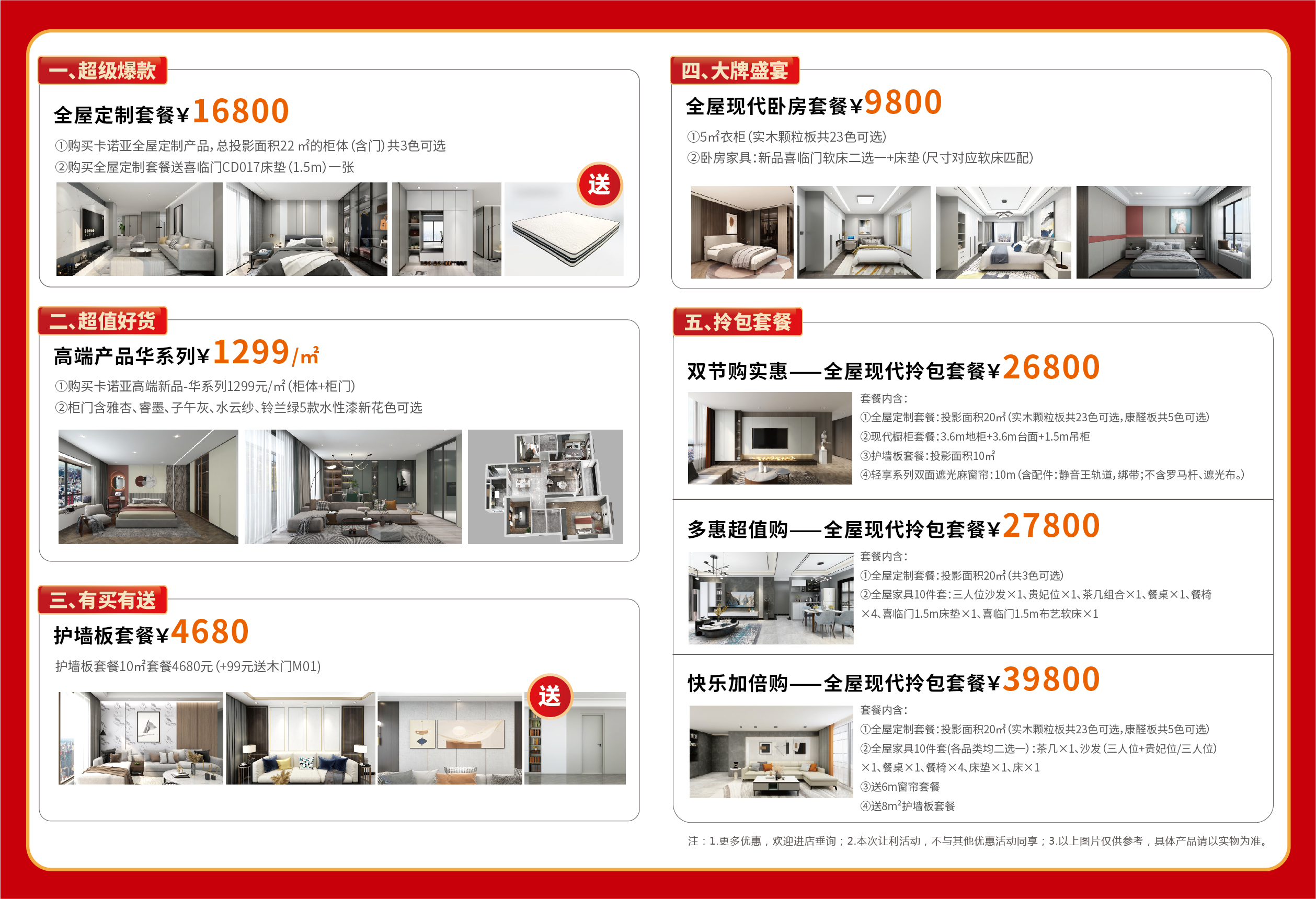 此次鉅惠,主要包括經(jīng)典全屋定制套餐¥16800,高端產品華系列¥1299/㎡,護墻板套餐¥4680,全屋現(xiàn)代臥房套餐¥9800,全屋現(xiàn)代拎包套餐¥26800、¥27800、¥39800,將優(yōu)惠進行到底。