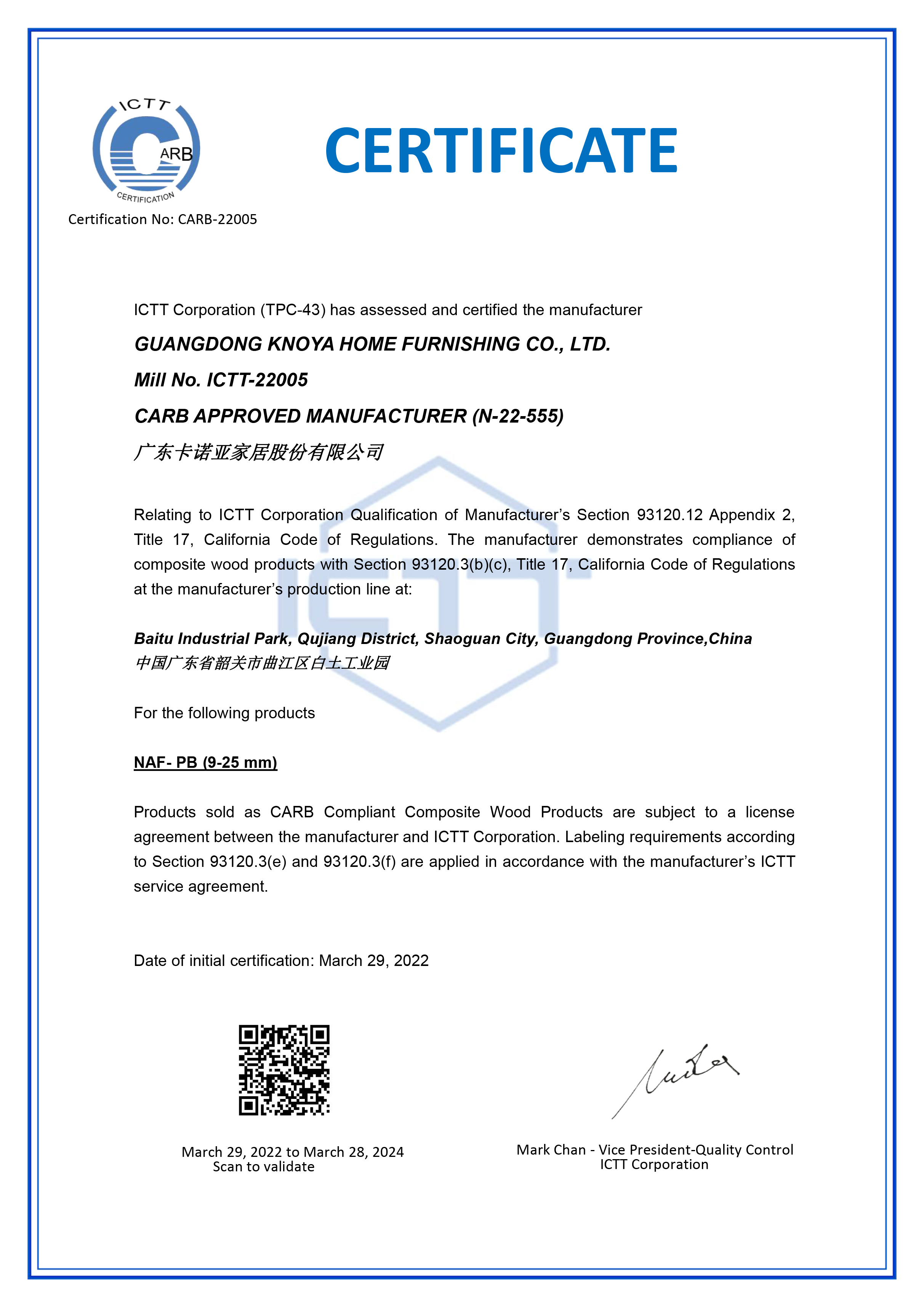 據(jù)悉,卡諾亞康醛板順利通過檢測,獲得美國環(huán)保署(EPA)及加州空氣資源委員會(CARB)兩大機(jī)構(gòu)頒發(fā)的NAF無醛豁免認(rèn)證。斬獲兩大認(rèn)證,意味著康醛板甲醛釋放量符合美國有毒物質(zhì)控制法的最高要求,即無醛豁免,對康醛板甲醛釋放量的項目免檢,讓康醛板在全美地區(qū)暢通無阻。獲得NAF認(rèn)證并非易事,它要求板材在生產(chǎn)過程中,不使用、不添加任何含有甲醛成分的膠水、助劑等,這使得NAF成為目前全球板材甲醛釋放量要求至高的認(rèn)證之一。