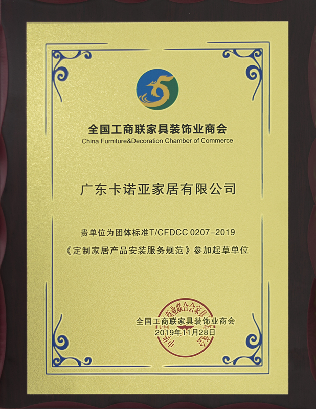 近日,中國全屋定制十大品牌之一的卡諾亞,獲得由全國工商聯(lián)家具裝飾業(yè)商會(huì)頒發(fā)的“中國家居業(yè)高質(zhì)量發(fā)展示范企業(yè)”,同時(shí)卡諾亞還成為團(tuán)體標(biāo)準(zhǔn)T/CFDCC0207-2019《定制家居產(chǎn)品安裝服務(wù)規(guī)范》參加起草單位,這是對卡諾亞專注定制家居18年品牌實(shí)力的肯定與鼓勵(lì)。